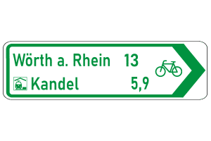 Pfeil- und Tabellenwegweiser liefern zahlreiche Informationen zum Radwanderweg. So lässt sich aus der ersten Zeile das Hauptziel und die Entfernung zu diesem ablesen, wohingegen die zweite Zeile über ein Unterziel wie etwa der nächste Ort von Interesse informiert. Zusätzlich Piktogramme könne darüber hinaus auf einen Bahnhof oder einen Campingplatz hinweisen. Im Gegensatz dazu zeigen Zwischenwegweiser lediglich den weiteren Routenverlauf an einer Kreuzung oder Abzweigung an. Nachfolgende Grafiken dienen der Veranschaulichung:
